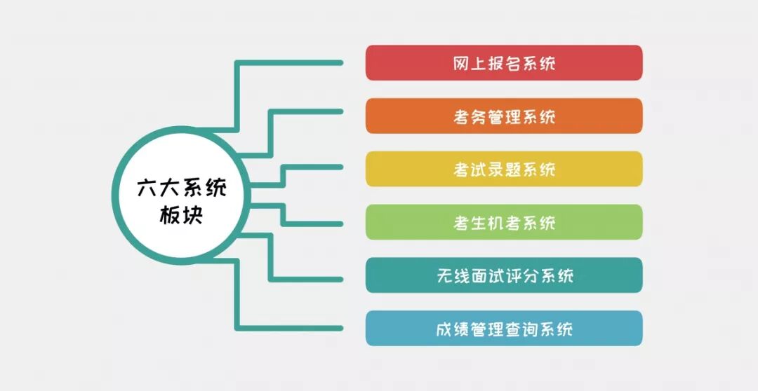 系统建设涵盖网上报名系统、考务管理系统、考试录题系统、考生机考系统、无线面试评分系统以及成绩管理查询系统六大板块,可对整个招生考试工作实施信息化管理,并对各项数据进行严格保密和监控。